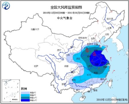 预计,30日8时至1月1日8时,西北地区东南部、华北大部、黄淮、江淮、江汉、江南、重庆东部、四川盆地北部、贵州大部、华南北部等地将出现6~10℃降温,其中,黄淮大部、江淮大部、江南东北部等地的部分地区降温幅度可达12℃;华北、黄淮、江淮、江南东部等地还将伴有5~7级偏北风。华北、黄淮等地的部分地区有扬沙天气。