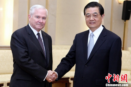 中新社北京1月11日电 (记者 陶社兰)中国国家主席、中央军委主席胡锦涛11日下午在人民大会堂会见了美国国防部长罗伯特•盖茨一行。