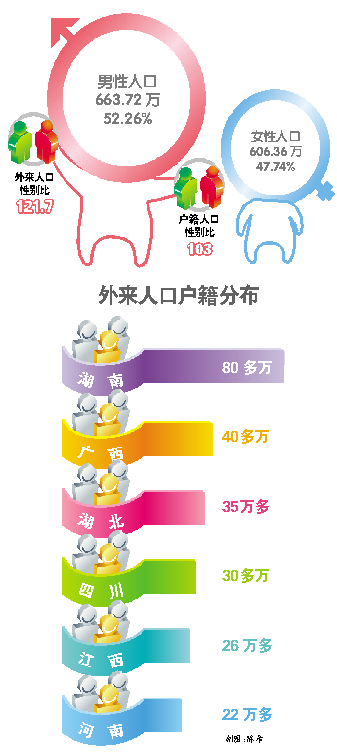 局长解读:广州市常住人口性别比为109.46,高于全国水平(105.2),与全省水平(109.0)接近。王旭东分析说,这主要是因为广州外来人口中男性比重较高,拉高了总人口的性别比。目前,广州户籍人口性别比在103左右,低于全国平均水平,也比“五普”的105.6低,但外来人口的性别比高达121.7,其中,来自省外的外来人口的性别比更是高达124.1。
