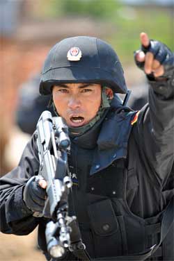 这些全身着黑色服装、脸戴黑色面罩的特战队员就是享誉国内外的武警雪豹突击队。这是他们参加“天山—2号”(2011)上海合作组织成员国执法安全机关联合反恐演习中的精彩一幕。他们的出色表现受到与会领导的高度评价。