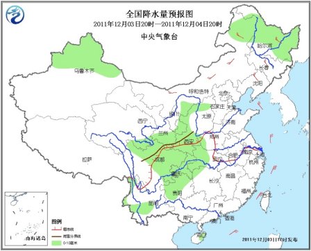 3日20时至4日20时,新疆北部、内蒙古东北部、黑龙江大部、川西高原北部、西北地区东部等地有小到中雪或雨夹雪,其中,新疆北部局地有大雪(5~8毫米);四川盆地、重庆、江汉西部、贵州西部和北部、云南中西部等地有小雨或阵雨;内蒙古中东部、东北地区等地有4~6级风;台湾海峡有7~8级、阵风9级的东北风,巴士海峡、南海东北部、中东部和西南部海域有6~7级、阵风8级的东北风。