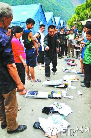 带领李木香他们的,是芦山城市建设投资公司的相关负责人袁杰,他很愧疚地向记者说:“村民们来帮忙是自愿的,没有任何报酬,我们目前甚至连工作餐都没办法提供。他们走很远过来,干完活儿再走回家做饭,他们其实都是灾民,却反过来帮助别人。”