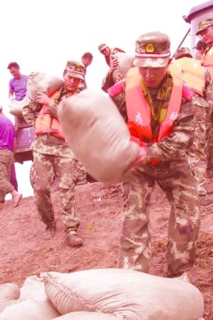 8月21日,在扎赉特旗努文木仁乡都尔本新村和两家子村护屯堤上,武警官兵和当地干部群众在钉铁桩、搬运沙袋。由于嫩江水回落缓慢,该堤长时间被浸泡,坝后坡松软,全线出现渗水、土流失等险情,500余名武警官兵和干部群众紧急排险固堤,消除险情。(记者 霍晓庆 通讯员 银洁 实习生 苏登科)