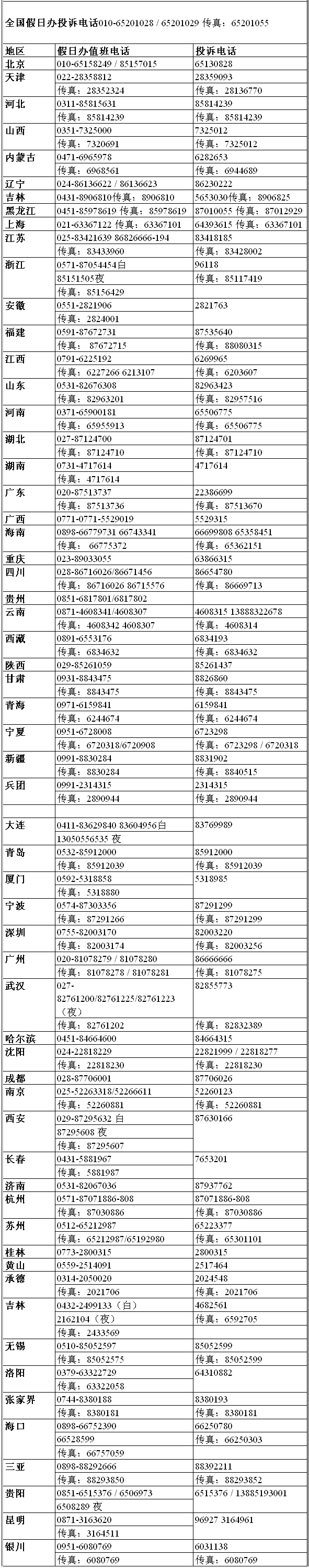 中新网9月26日电 今天,全国假日办公布了2006年“十一”黄金周各省(区)市假日旅游协调机构的旅游投诉电话。具体见下表——