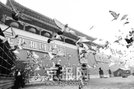 清晨7时36分,伴随着雄壮的国歌声,当冉冉升起的国旗快升到旗杆顶端时,站在金水桥上的天安门管委会指挥员用力挥动了一下双臂,工作人员打开了车厢两侧的笼门,1万羽和平鸽腾空而起,从金水桥两边同时向东南和西南方向飞去,先是在金水桥和广场上空久久盘旋数圈,然后在看升旗的群众目光注视下,渐渐飞往远方……(王蔷)