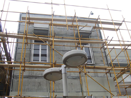 修葺工作一个月前即已开始。在经历了一年又八个月的等待后,日本驻上海总领事馆那些破碎的玻璃窗和凹凸不平的外墙,正在维修工人的劳作下改变着容颜。