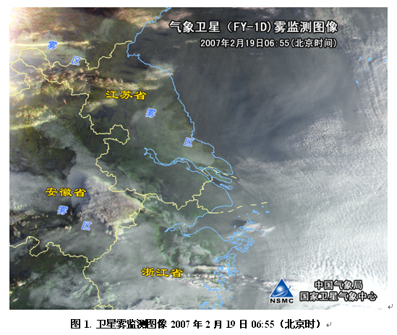 今天早上,FY-1D气象卫星监测到,安徽、山东、江苏等省有大雾,部分雾区被云层覆盖,部分公路、铁路、航运交通受到影响,给春节出行带来不便。