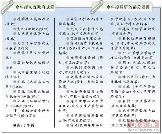 除上述计划完成的规章项目外,今年市政府还安排了18个规章调研项目,内容主要包括城市设施管理、公共安全与应急管理、市场监管、建筑节能、交通以及教育、卫生、文物保护和民政事务等方面。(杨华云)