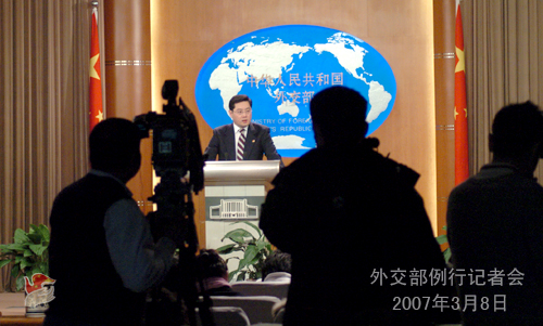 中新网3月8日电 据外交部网站消息,2007年3月8日下午,外交部发言人秦刚主持例行记者会,就人权、中国国防建设、中日关系、六方会谈和非法移民等问题回答了记者提问。