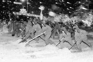 [新闻背景]这是一场罕见的暴风雪。受贝加尔湖强冷空气和江淮气旋共同影响,从3月3日夜间至5日凌晨,一场56年来最大的暴风雪袭击了辽宁省、吉林省东部及黑龙江省东南部地区。部分地段自然堆雪一米以上,最大降温达到15℃,交通几近瘫痪……灾情就是命令。沈阳军区迅速组织部队和民兵预备役人员,帮助群众除雪救灾。