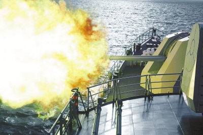 “连云港”舰左副炮立即对准“目标”,威严的炮口前,目标灰溜溜地驶离。