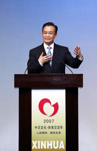 温家宝指出,在中日两国两千多年的友好交往史中,有两条纽带把我们紧密连在一起:一条是经济纽带,一条是文化纽带。文化是心灵的语言,艺术是情感的载体,文化艺术为两国人民架起了沟通心灵和情感的桥梁。中日文化体育交流年是两国政府确定的重要文化交流活动。它将进一步加深两国人民相互了解,播撒友谊的种子。