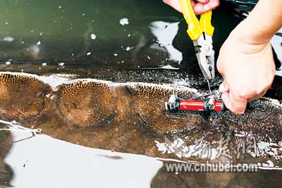 昨天中午,长江水产研究所研究员陈细华等人,为“中华鲟女王”安装了四种标志,以对其进行跟踪监测。