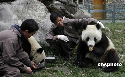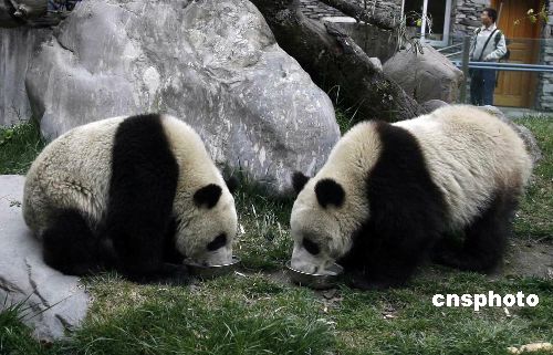 中新网成都4月26日电 (记者肖龙联 杨杰) 春雨潇潇,难得的一场喜雨缓解了蜀中干旱,也为两只赠港大熊猫洗尘。今天中午十一时五十八分,载着两只赠港大熊猫的集装箱从卧龙出发安全抵达成都市双流机场,等待在这里众多媒体记者一拥而上,抢拍这一难得的画面。负责运送的南方航空公司和卧龙中国大熊猫研究保护中心以及成都双流机场举行简短的交结仪式,十二时七分将这两大熊猫运去称重量,预计下午二时起飞赴港。