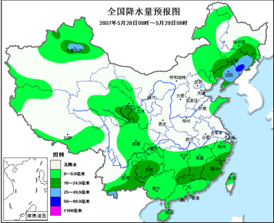 28日08时至29日08时,新疆北部、西藏东部和南部、青海中北部、甘肃西部、川西高原东部等地阴有小到中雨(雪)或雨夹雪,其中,新疆天山北部的局部地区有大雨;内蒙古中东部、河北东北部、东北地区大部、山东半岛、江南大部、华南以及西南地区东部等地阴有小到中雨,其中,吉林东部、辽宁中东部以及云南南部等地的部分地区有大雨、局地有暴雨,上述部分地区并可能伴有短时雷雨大风等强对流天气。新疆北部有4~6级、山口地区7~9级偏北风;内蒙古中部和东部偏南地区、东北地区南部、山东半岛等地有4~5级间6级偏北或偏南风,南疆盆地的部分地区有扬沙或浮尘。