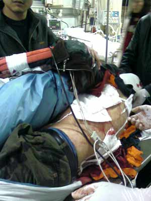 不到10分钟120救护车赶来了,医护人员马上在现场对金实施压迫止血,路人协助120把金紧急送往湘雅医院附一医院抢救。据参与抢救的主任医师介绍,金现场失血超过 2000毫升,处于失血休克状态。对金的抢救手术持续了十个多小时,共输血输液6000 多毫升。