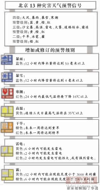 孙继松说,《北京市气象灾害预警信号与防御指南》将取代《〈北京市突发气象灾害预警信号〉实施办法》,在原灾害种类和标准的基础上增加或修订了部分灾害天气的预警级别,如增加了“暴雨蓝色预警”、“暴雪蓝色预警”、“高温黄色预警信号”等;新增近年来危害严重的干旱、雷电、霾等灾种;同时,对某些预警标准进行了修订,如对暴雪、寒潮、霜冻、道路结冰等不同等级的预警标准进行了调整,对沙尘暴的黄色、橙色预警时效也进行了调整,由24小时改为12小时。
