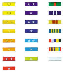 级别资历章架由资历章架的排数确定级别,每排应当排满3枚略章。军委委员以上7排,大军区级6排,军级5排,师级4排,团级3排,营级2排,连、排级1排。 级别资历章组合规则(1)级别略章应当排列在级别资历章架最上一排中间位置,军龄略章和补充略章排列在其他位置。(2)军龄略章按照1年至10年的顺序,在级别资历章架上从左至右、从上到下依次循环排列。(3)如使用10年军龄略章,应当尽量排列在该排的中间位置。(4)补充略章用于军龄略章不足以排满级别资历章架时的补充,应当尽量避免使用,如必须使用,应当排列在最下一排的两侧位置,一般不得超过2枚。(5)如果军龄略章采用上述方式不足以排满级别资历章架,应当减少4年以上高年限军龄略章的使用,改用3年以下低年限军龄略章进行循环排列,直到排满级别资历章架为止。