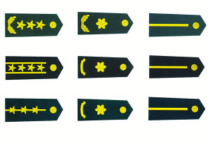 军衔标志 军衔标志包括军衔肩章、军衔袖章和军衔领章。军衔肩章分硬肩章、软肩章和套式肩章3种。硬肩章套在礼服或常服的肩袢上,用免缝扣穿过硬肩章锁眼、肩袢锁眼和肩部孔眼,旋紧固定。软肩章套在夏常服的肩袢上,将纽扣系于肩章锁眼和肩袢锁眼上。套式肩章套在肩袢上,用免缝扣穿过肩袢锁眼和肩部孔眼,旋紧固定,或者纽扣系于肩袢锁眼上。军衔领章与作训服衣领上的尼龙搭扣粘合固定。海军军衔袖章,由专业人员按下图所示缝制和缀钉。