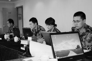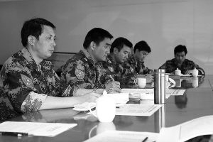 人还没进屋,一阵急促敲击键盘的声音就传至耳中,演习前浓浓的“硝烟味”扑面而来。屋子当中是一张长长的会议桌,上面摆着多台便携电脑,一台投影仪正将“和平使命-2007”联合反恐军事演习“红”“蓝”双方态势图清晰地映射在对面墙上。桌子四周,一群身着新式迷彩服的参演军官正在紧张地作业。中方导演部首长正坐镇指挥。