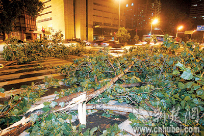 昨晚,在汉口建设大道看到,从三眼桥到取水楼,沿途有近20棵树被吹倒,断枝、树叶满地都是;黄浦大街工农兵路一棵15米长的大树被吹倒在地,将整条马路拦断;杨汊湖四院市委党校旁边,一棵近20米高的大树倒了,将电线都拉断;汉阳大道钟家村往江边方向,一棵大树倒下,一20岁左右的女子被砸伤。