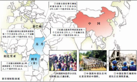 目前,中国共有10支维和部队1546人在4个联合国任务区执行维和任务。其中,在联合国刚果(金)特派团派有218人;在联合国利比里亚特派团派有558人;在联合国驻黎巴嫩临时部队派有335人;在联合国苏丹特派团派有435人。