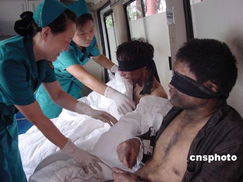 中新网陕县8月1日电(记者 朱晓娟 李凌 张力华)经过各方近四天的不懈努力,截至十二时五十三分,备受关注的河南陕县矿难六十九名被困矿工已被成功全部救出。当时他们的眼睛蒙着黑布,其中有两个人是用担架抬出来的,其他的大部分都是被搀着出来的,出井后马上被救护车拉走。