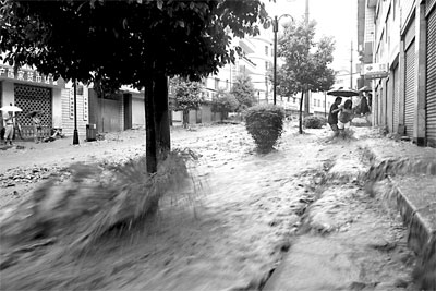 30日上午,在佛坪县城,裹挟着石块和树木的洪流径直涌入县城各居民小区和街道,洪水和淤泥达1米多深。大量房屋被冲毁,街道上随处可见残损的电器和家具,沿街所有的门面房基本上都进了水。