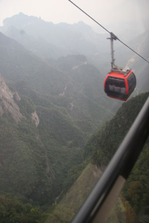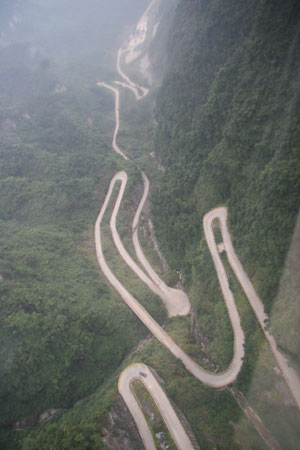下至半山,转过九十九道湾的山路,至天门洞前。此山因洞而得名,天门洞高百余米,最窄处不过十多米,因曾经有过两次飞机特技穿行山洞而闻名天下。