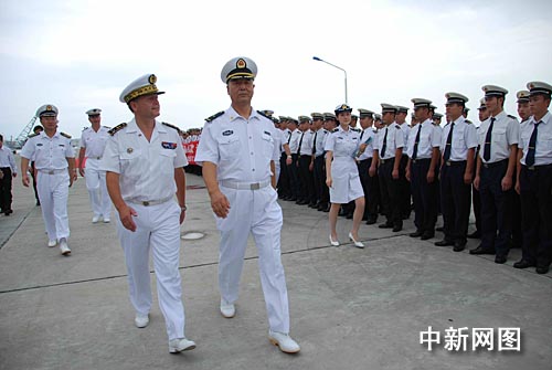 中国海军在码头上举行了热情的欢迎仪式。南海舰队副参谋长么志楼将军与雅克•洛奈将军握手,对法舰到访湛江表示欢迎。两位将军还在码头各自发表了简短的讲话。