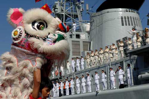 澳大利亚国防部长尼尔逊、先期到达的中国海军北海舰队司令员苏士亮等,到码头迎接我海军舰艇编队。当地华侨华人打着“热烈欢迎中国海军舰艇编队”的横幅,舞动着中澳两国国旗和鲜花,向到访的中国海军官兵致意。