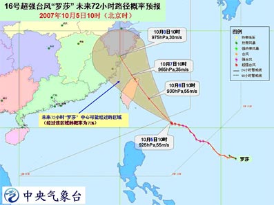 中新网10月5日电 中央气象台今天上午十点钟发布超强台风警报:今年第16号超强台风“罗莎”(Krosa)的中心今天上午10点钟位于中国台湾省花莲市东南方大约520公里的西北太平洋洋面上,就是北纬20.5度,东经125.1度,中心附近最大风力有16级(55米/秒)。
