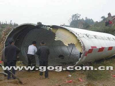 昨日,记者在主体残骸坠落地现场看到:一个像中巴车般大小的圆柱体横躺在已收割的包谷地里,由于残骸坠落时巨大的冲击力,圆柱体已略变椭圆,但仍较为完整,一个铁架子的几支脚已钻进了泥土里,还有一个像大塑料长管子的物件坠落在一姓吴的农家房屋中堂,并将该堂屋击坏。