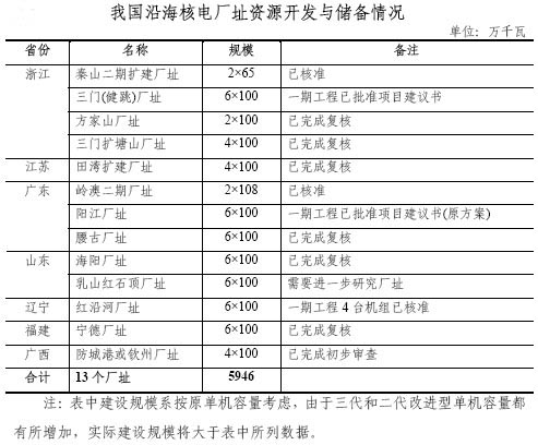 该《规划》指出,经过多年努力,中国已储备了一定规模的核电厂址资源。除已建和在建工程外,在沿海地区开展前期工作已较充分的厂址还有5000多万千瓦(见上表)。此外,2004年以来,在广东粤东(田尾厂址)地区,浙江浙西地区、湖北、江西、湖南等地都开展了核电厂址普选工作,进一步增加了核电厂址储备。
