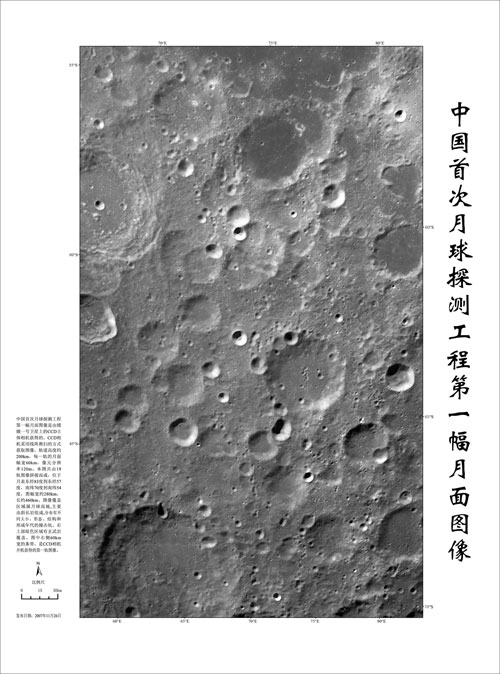 嫦娥一号卫星于10月24日从西昌卫星发射中心由长征三号甲运载火箭成功发射,经过8次变轨后,于11月7日正式进入工作轨道。经过星上设备调试,11月18日卫星转为对月定向姿态,11月20日开始传回探测数据,经过处理制作完成了第一幅月面图像并同时完成了三维影像的制作。