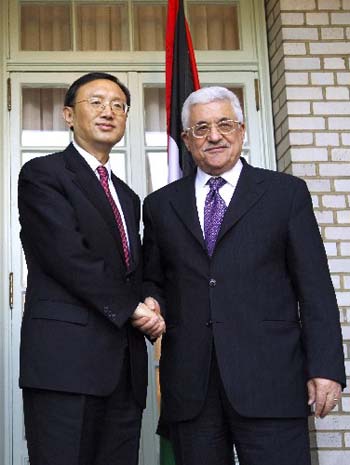 中新网11月28日电 据中国外交部网站消息,11月27日,中国外交部长杨洁篪在美国马里兰州安纳波利斯市出席中东问题国际会议期间会见了巴勒斯坦民族权力机构主席阿巴斯。杨洁篪表示,中方将同国际社会一道,积极落实有关后续行动,推动中东问题早日得到妥善解决。