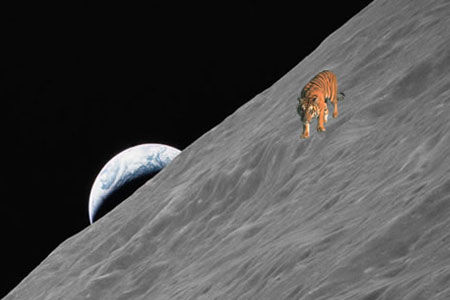 一个头脑机灵的网民把华南虎“调”到月球上。利用电脑合成软件,他把老虎照和月亮成像照合成在一起,上写说明云:“嫦娥一号发回首张照片,月球上发现华南虎一只,专家正在对照片真假做鉴定,预计结果将会在中国人登月后公布(大约2020年)。”