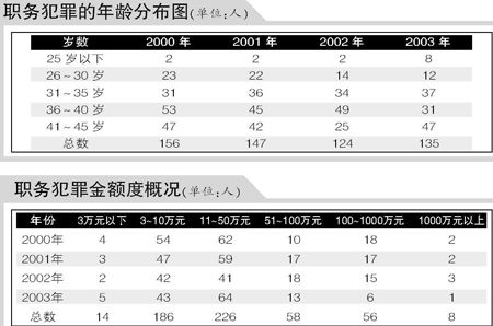 卢铁峰说,目前,广州青年职务犯罪人数的85%年龄在30岁~45岁,他们掌握了一定权力,有许多是单位和部门主管等。据不完全统计,2000年广州青年职务犯罪中的单位领导(包括部门领导)为98人,2001年为99人,2002年为63人,2003年为71人,其中不乏处级、厅局级干部。