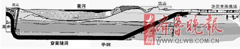 在车上,傅总工给记者画了一张隧洞的示意图。记者看到,黄河隧洞由斜洞、平洞、竖洞三个部分组成。其中,入口是一个竖洞,从江苏扬州即长江下游抽引而来的长江水,经过一路奔波,就从这里入洞。和竖洞底部相连接的,是一个平洞,位于黄河河床下70米的位置,长江水从竖洞飞流直下,经这里穿过黄河,然后,长江水从斜洞奔腾而出,流入输水管道,前往京津地区。