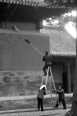 29日上午,记者进入孔庙,发现工作人员正在对大中门、东华门等附近游客出入必经的砖铺甬道进行精心修复处理。这些甬道都是由青砖铺成,有的地方由于踩踏过多出现损毁或塌陷,工作人员都重新进行了仔细地铺装整理。在奎文阁、碑亭等处,工作人员用加长的鸡毛掸子,拂去建筑墙体上的浮尘,使得古建筑更为鲜亮。