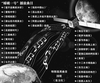 2006年7月7日,国防科工委宣布,要从数量庞大的中国乐曲中征集、遴选出30首优秀乐曲,随嫦娥一号卫星搭载升空,在卫星距地球38万公里的月球轨道上播放,并公布了150余首建议曲目。同年10月6日,国防科工委宣布,以公众投票票数的多少决出了《谁不说俺家乡好》、《爱我中华》、《歌唱祖国》等30首歌曲。而我国的国歌《义勇军进行曲》和由我国第一颗人造地球卫星“东方红一号”在太空奏响的乐曲《东方红》因其特殊的地位,将另行安排在嫦娥一号卫星上搭载播放。