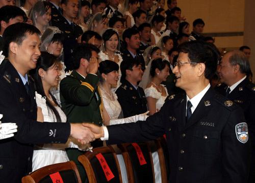 中新网1月18日电 据公安部网站消息,1月17日下午,公安部党委书记、部长孟建柱会见了参加公安部2008年春节电视文艺晚会集体婚礼的100对基层新婚民警夫妇。