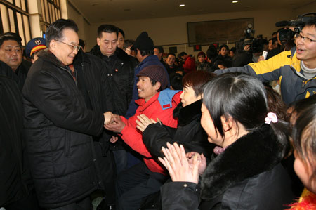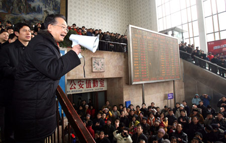 温家宝还来到长沙火车站看望滞留车站的乘客。他动情地说:“对大家滞留在这里,我向大家表示歉意,我们正在抓紧抢修,首先是抢修电网,电网通了以后,火车就会通了,不需要很多的时间,大家就可以回家过年。春节快到了,我给大家拜个早年,谢谢大家!”