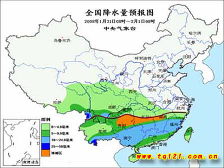 中新网1月31日电 据中央气象台预报,31日起,中国南方大部自西向东将有一次明显雨雪天气过程。江南南部、华南北部的部分地区有大雨,局部地区有暴雨;西藏东南部、川西高原南部、云南西北部和东北部、贵州北部、湖北南部、湖南中北部、江西北部、浙江中北部、苏皖南部等地的部分地区有大雪,局地有暴雪;贵州大部、湖南中南部、江西中部等地的部分地区有冻雨。