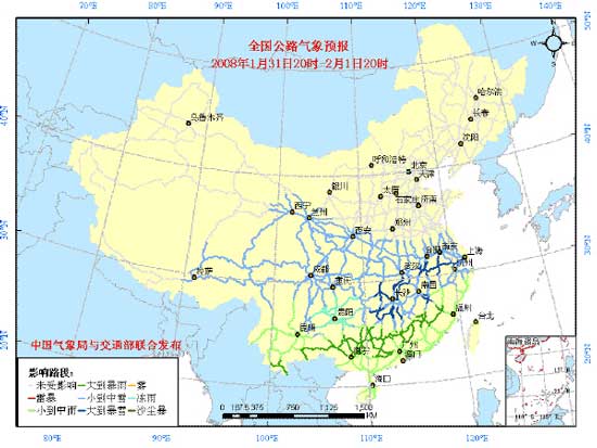 全国公路气象预报(2008年1月31日20时-2月1日20时)