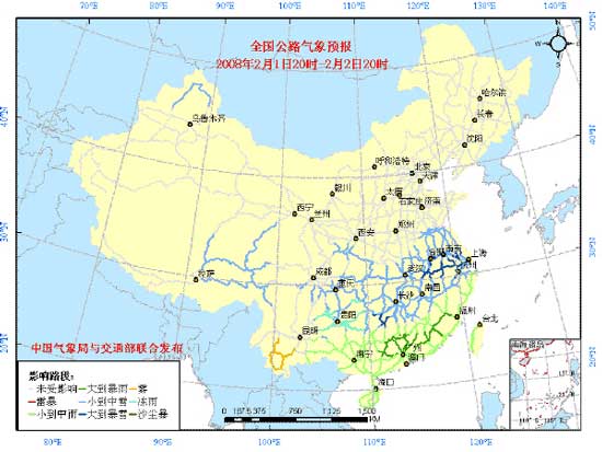 全国公路气象预报(2008年2月1日20时-2月2日20时)
