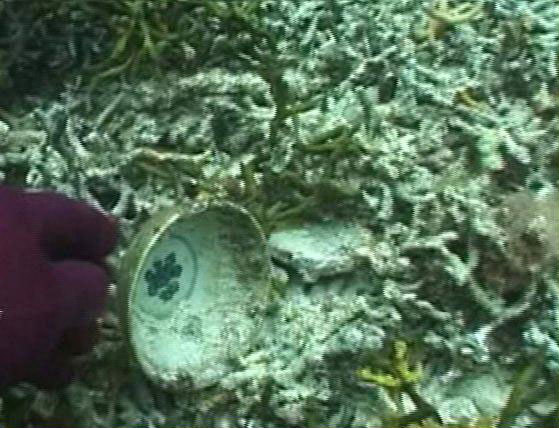 解说3:从海底打捞出的瓷器碎片让文物专家非常震惊,这艘水下沉船到底埋藏了多少文物,要不要马上打捞,怎样进行打捞,权衡利弊之后,国家文物局停止了继续打捞的计划。