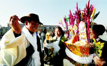 昨天,拉萨市城关区鲁古居委会的居民在大昭寺广场互敬象征五谷丰登的“切玛”。西藏各族人民按照传统习俗穿上节日盛装,互敬象征五谷丰登的“切玛”和哈达、青稞美酒,表达自己的祝福。