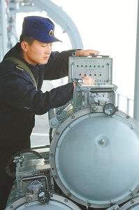 鱼雷兵对鱼雷进行发射前检查(王松岐/摄)