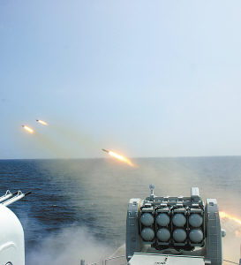对“敌”潜艇发射舰艏火箭深弹(于文献/摄)